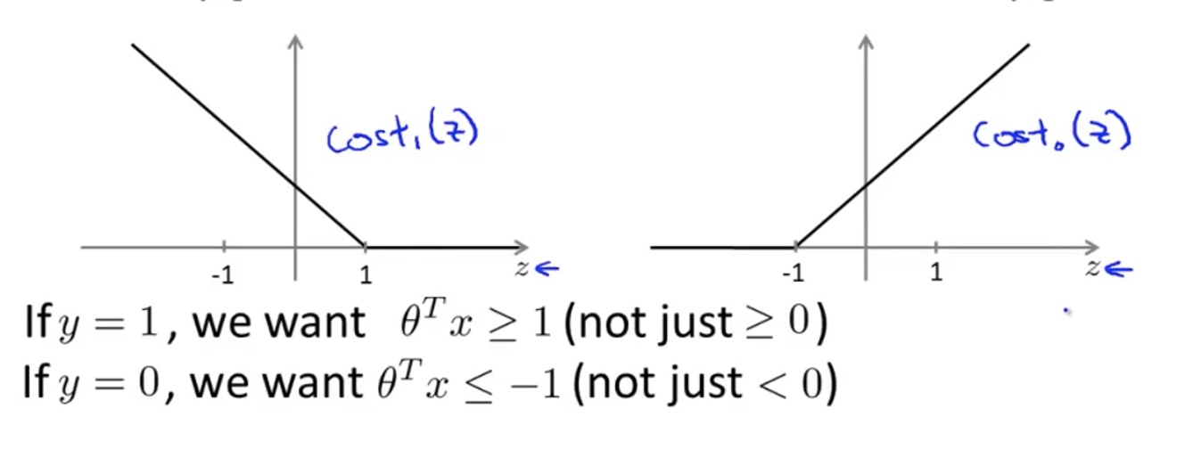 \[\min _{\theta} ~~~C \sum_{i=1}^{m}\left[y^{(i)} \operatorname{cost}_{1}\left(\theta^{T} x^{(i)}\right)+\left(1-y^{(i)}\right) \operatorname{cost}_{0}\left(\theta^{T} x^{(i)}\right)\right]+\frac{1}{2} \sum_{i=1}^{n} \theta_{j}^{2}\]